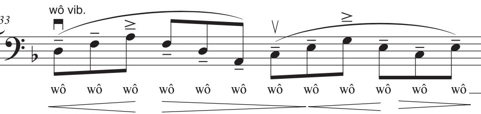 “Wô- Wô- Wô” Atinge- se com um vibrato rápido da mão esquerda (mas não tão rápido quanto o do Zeca) e com um arco que destaca esses impulsos através da dicção, sem nunca perder a direcção da frase. Ver vídeo para exemplificação. |
