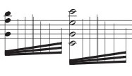 Ritmo ad libitum O acorde é apresentado verticalmente, mas deve ser tocado em arpejo, seguindo a indicação de velocidade representada pelas linhas inferiores: quanto mais linhas, maior a rapidez do gesto. |