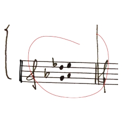 Grito Este gesto procura recriar os gritos “gemidos” presentes no original, que devem transmitir uma sensação quase de horror. O objetivo não é produzir uma nota definida, mas sim um ruído expressivo e visceral. Tecnicamente, pode ser entendido como um glissando em corda dobrada, com o arco em sul ponticello (SP). Tanto a velocidade da mão esquerda como a do arco devem ser lentas, como se fosse difícil mexer as mãos. |
